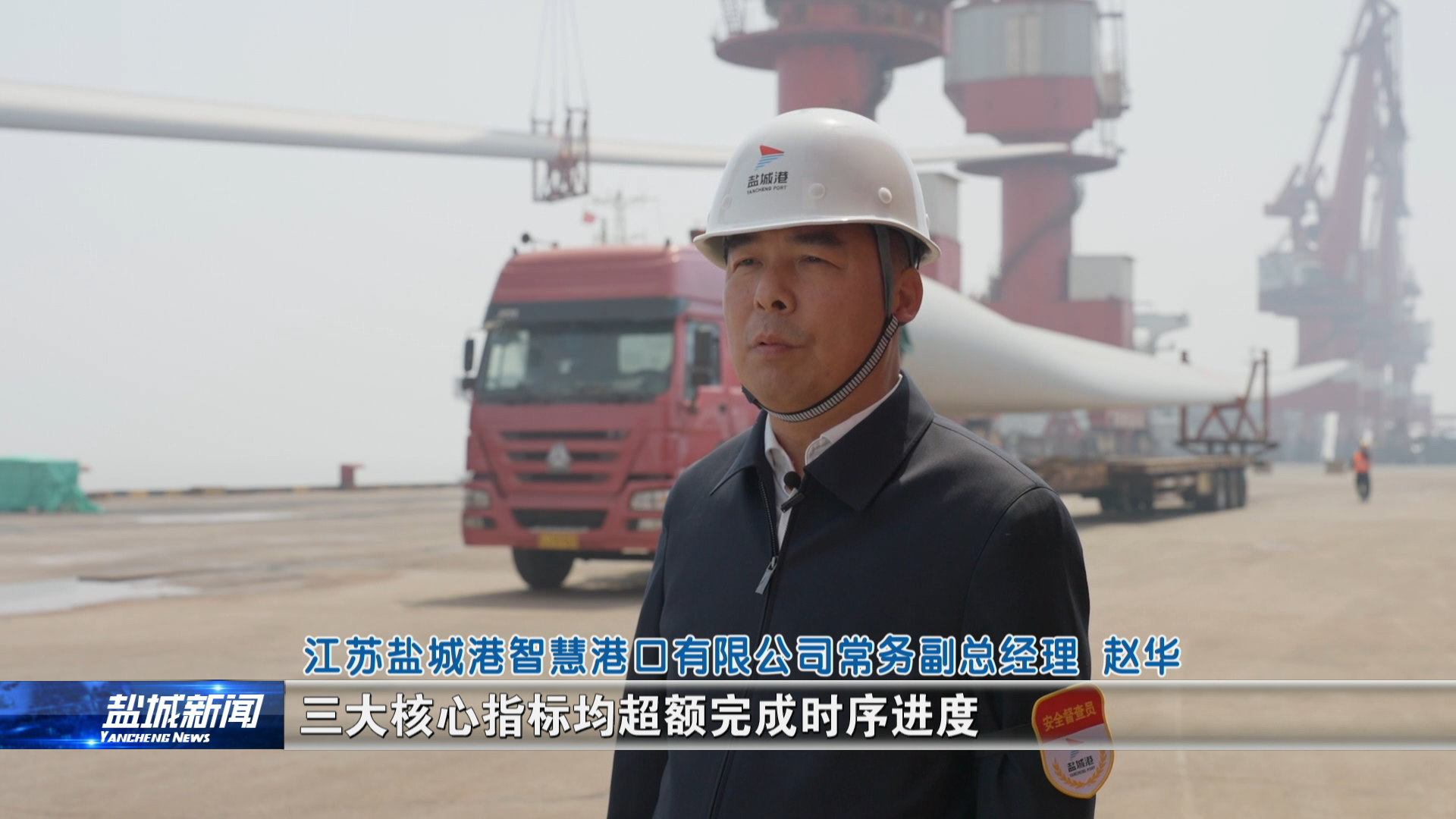走進鹽城港大豐港區,映入眼簾的是一片繁忙生產景象,各類機械設備高效運轉,運輸車輛往來穿梭,現場各個生產環節緊密銜接。一號泊位上,“新納斯1號”貨輪整裝待發,工作人員熟練地操作門機將風電葉片裝船,這批代表中國智造水準的“大國重器”即將起航韓國。