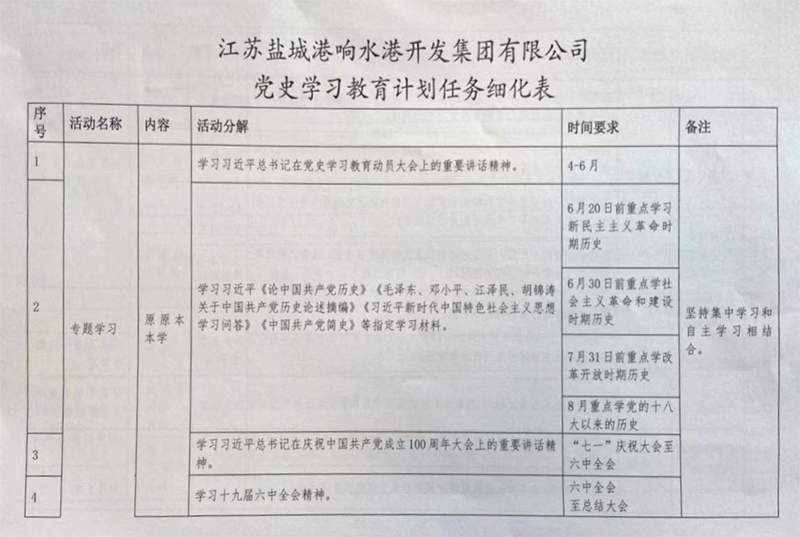5月29日,響水港區(qū)在集中學(xué)習(xí)會(huì)上傳達(dá)學(xué)習(xí)了《響水港黨史學(xué)習(xí)教育計(jì)劃任務(wù)細(xì)化表》,向全體黨員和員工講知了細(xì)化任務(wù)。圍繞指定四本學(xué)習(xí)書(shū)籍,分期分段學(xué)習(xí),做到有學(xué)習(xí)、有研討、有發(fā)言、有體會(huì),讓黨史學(xué)習(xí)教育往深里走、往實(shí)里走,促使黨員干部進(jìn)一步增強(qiáng)“四個(gè)意識(shí)”,堅(jiān)定“四個(gè)自信”,做到“兩個(gè)維護(hù)”。