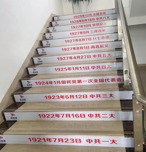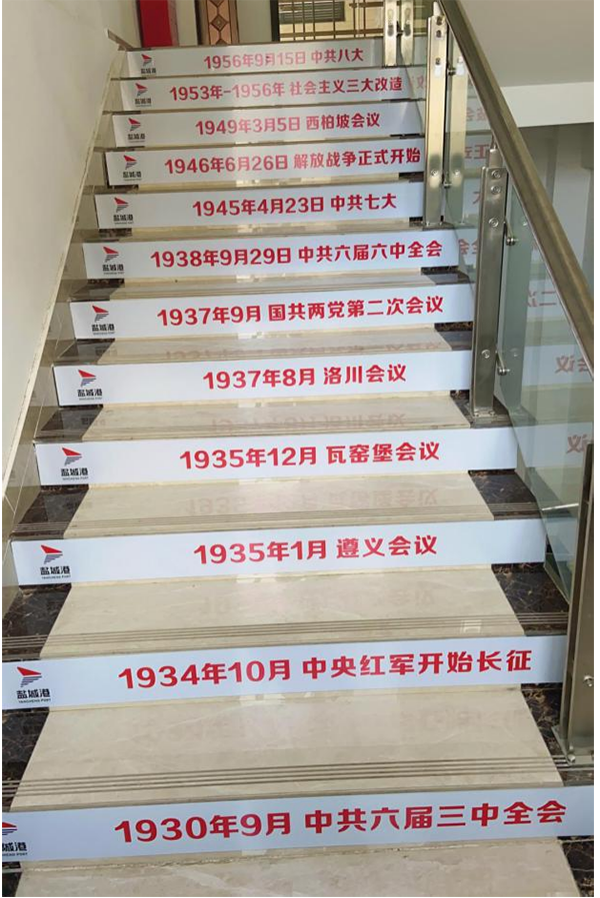 針對(duì)廣大干部職工工作實(shí)際,響水港區(qū)精心設(shè)計(jì),細(xì)心研究,將學(xué)習(xí)形式和載體不斷創(chuàng)新。近日,響水港區(qū)創(chuàng)新打造“樓梯課堂”,將黨史發(fā)展時(shí)間歷程貼印在樓梯上,方便大家在上班閑暇時(shí),無(wú)形地將黨史知識(shí)學(xué)進(jìn)腦子里。“樓梯課堂”的每一個(gè)階梯同時(shí)也代表著黨的每一個(gè)發(fā)展歷程,一步一臺(tái)階,扎扎實(shí)實(shí)譜新篇。響水港區(qū)員工普遍反映這個(gè)學(xué)習(xí)方式有創(chuàng)意有實(shí)效,鞏固加深了他們對(duì)黨史的掌握程度,也提高了他們學(xué)習(xí)黨史的興趣。