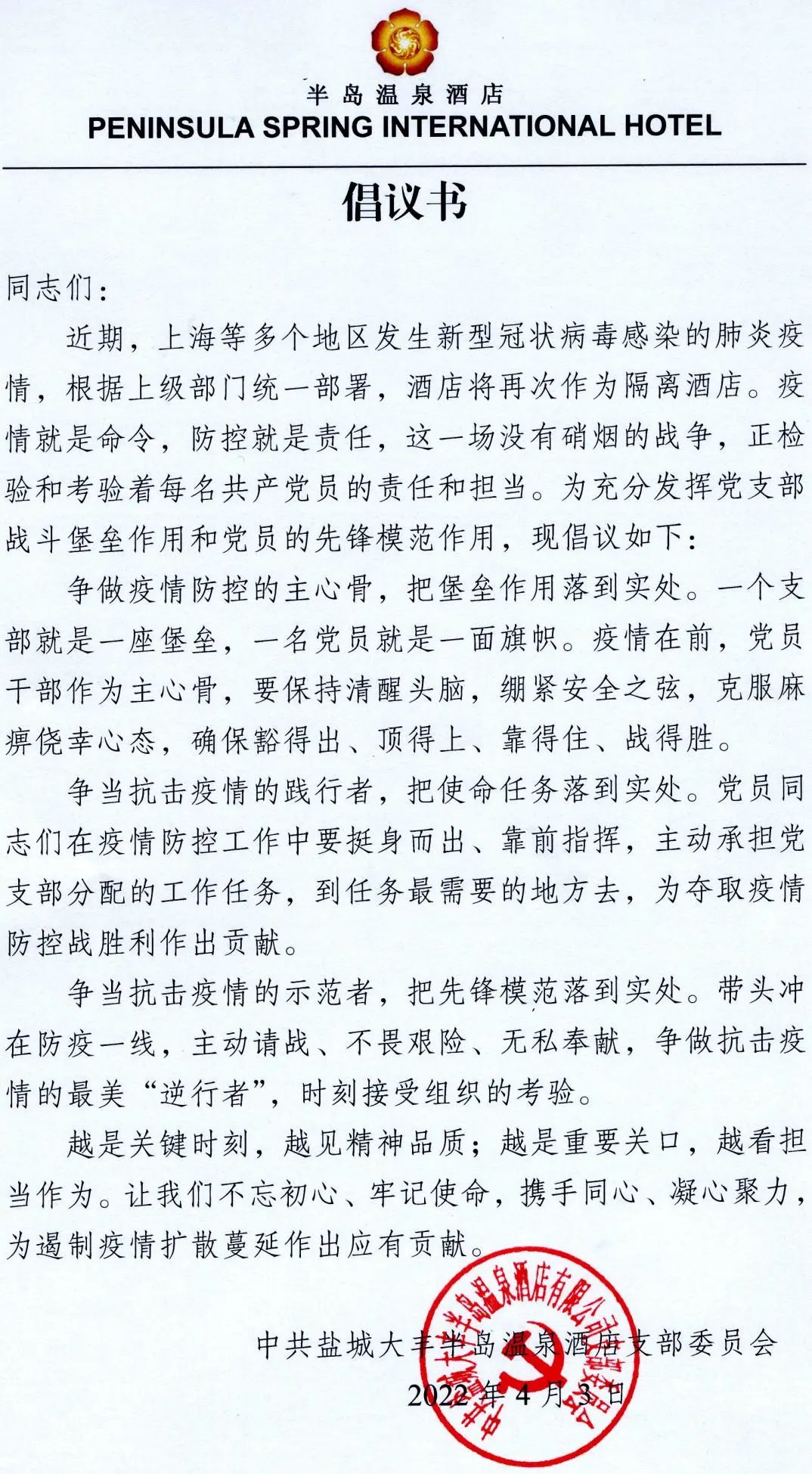 “我請愿:自愿參加酒店一線防疫工作,充分發(fā)揮黨員先鋒帶頭作用,堅決打贏疫情防控阻擊戰(zhàn)。”“我請愿:做嚴明紀律的踐行者,做擔當履職的戰(zhàn)斗員,請領(lǐng)導(dǎo)批準我參與此次隔離任務(wù)。”“我是一名入黨積極分子,我志愿參與酒店疫情防控任務(wù),請讓我上一線”……一封封按著紅色手印的《請戰(zhàn)書》被遞交到鹽城港文旅集團旗下半島溫泉酒店黨支部。
