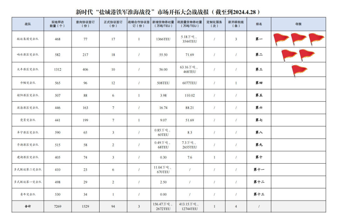 2.簽訂意向協(xié)議數(shù)量1529份:其中大豐港區(qū)突擊隊406份,響水港區(qū)突擊隊217份,黨員突擊隊199份,濱海港區(qū)突擊隊163份,巾幗突擊隊96份,射陽港區(qū)突擊隊88份,航運集團突擊隊77份,建湖港區(qū)突擊隊74份,阜寧港區(qū)突擊隊65份,亭湖港區(qū)突擊隊58份,青年突擊隊34份,多式聯(lián)運第一突擊隊29份,多式聯(lián)運第二突擊隊23份。