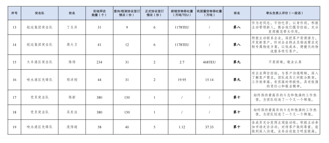 第一名:巾幗突擊隊 李婷婷(拜訪客戶312家,簽訂意向協(xié)議56份,簽訂正式協(xié)議5份,新增貨物吞吐量88TEU,鞏固量貨物吞吐量202TEU);黨員突擊隊 朱燕(拜訪客戶180家,簽訂意向協(xié)議140份,簽訂正式協(xié)議7份,新增貨物吞吐量10萬噸,鞏固量貨物吞吐量51.69萬噸)