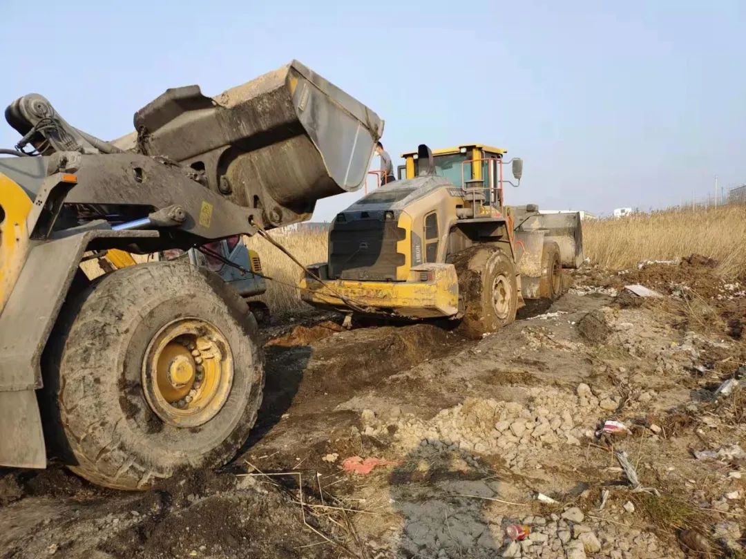 面對連續的失敗,響水港區團隊再次展現出了百折不撓,迎難而上的港口工匠精神,深刻剖析前兩次失敗原因,再次調集一臺小型挖機對事件車輛輪子周邊淤泥進行清理,回填石子提升其自身摩擦力,同時針對涉險裝載機陷入太深可能造成底盤擱置等情況,調配一輛裝載機協助抬升予以解決,并再次調集一輛裝載機采用接力模式增加牽引力。經過多臺機械的通力配合,受困裝載機終于在拖拽中緩緩駛出泥潭,圓滿完成救援工作。