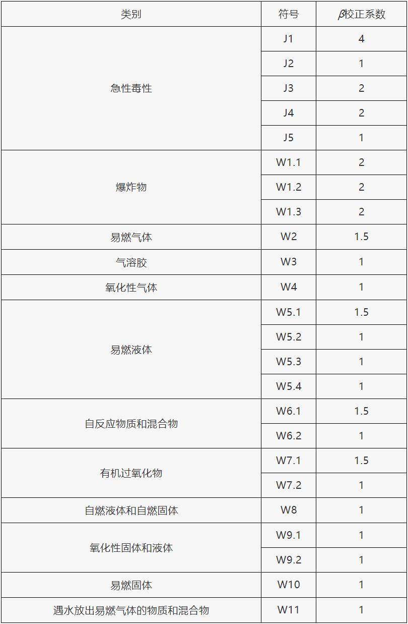 根據單元內危險貨物的類別不同,設定校正系數(β)值,在表1范圍內的危險貨物,其β值按表1確定,未在表1范圍內的危險貨物,其β值按表2確定。
