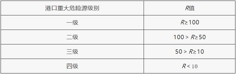 第五條 港口經營人應當對本單位的港口重大危險源進行安全評估,并確定重大危險源等級。港口重大危險源按照其危險程度,由高到低依次劃分為一級、二級、三級、四級。港口重大危險源分級方法見附件。