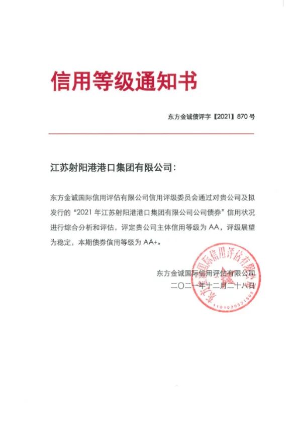 近日,經(jīng)過(guò)國(guó)內(nèi)權(quán)威信用評(píng)級(jí)機(jī)構(gòu)的綜合分析與評(píng)估,江蘇鹽城港射陽(yáng)港開(kāi)發(fā)集團(tuán)有限公司榮獲AA級(jí)主體信用評(píng)級(jí),評(píng)級(jí)展望為穩(wěn)定,成為繼江蘇大豐海港控股集團(tuán)有限公司之后,鹽城港集團(tuán)合并范圍下屬內(nèi)第二家AA級(jí)主體信用評(píng)級(jí)子公司。