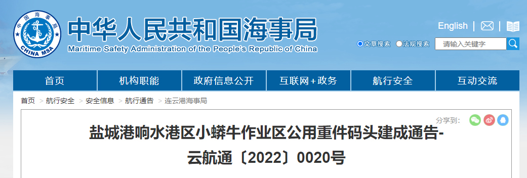 近日,連云港海事局在官網(wǎng)發(fā)布鹽城港響水港區(qū)小蟒牛作業(yè)區(qū)公用重件碼頭建成公告(通航公告)。該碼頭通航運營后將打開海河聯(lián)運出海通道,有效激活港口樞紐功能,更好統(tǒng)籌協(xié)調(diào)地方發(fā)展。