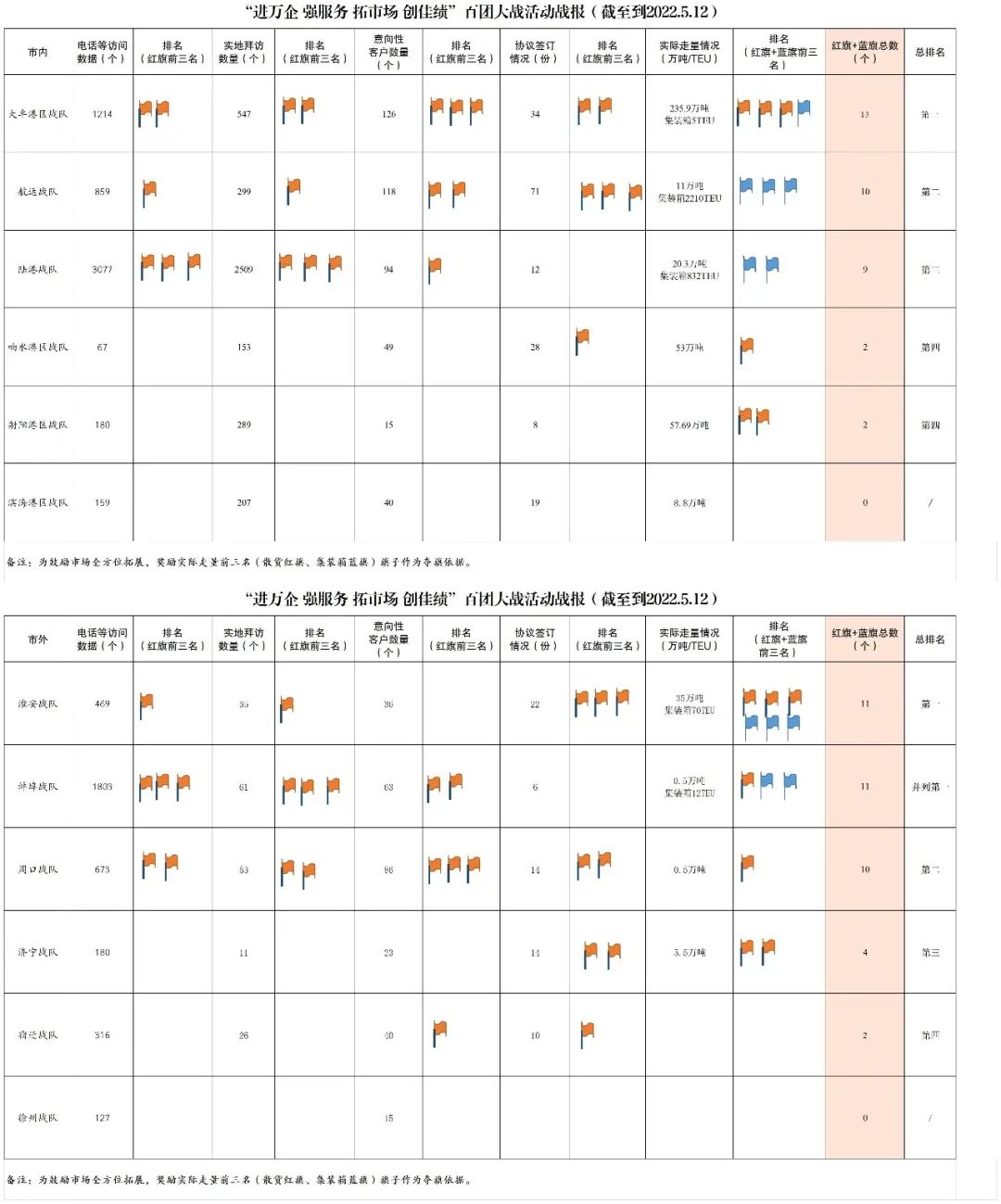 各戰(zhàn)隊(duì)累計(jì)拜訪客戶數(shù)據(jù)13314家,其中電話、視頻等訪問(wèn)9124家,實(shí)地拜訪4190家,意向性客戶705家,簽訂協(xié)議238份,實(shí)際走量428.19萬(wàn)噸、3129TEU。具體細(xì)分如下: