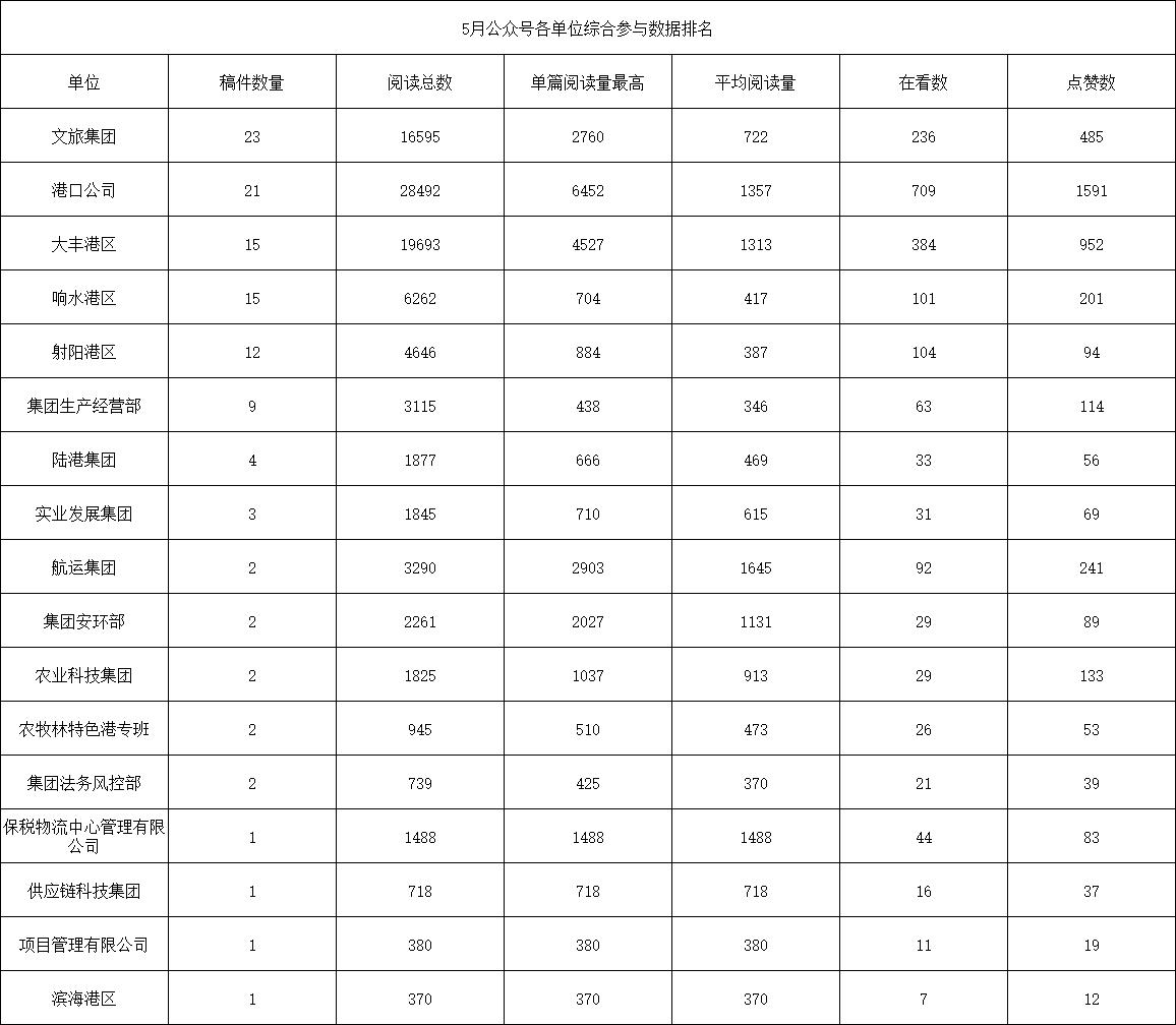5月,集團微信公眾號共發(fā)布116篇文章。總體閱讀數(shù)約9.5萬,各單位發(fā)稿更加活躍,希望大家保持一如既往的熱情,積極踴躍發(fā)稿,用最真實的數(shù)據(jù),為集團沖刺“雙過半”貢獻文字力量。