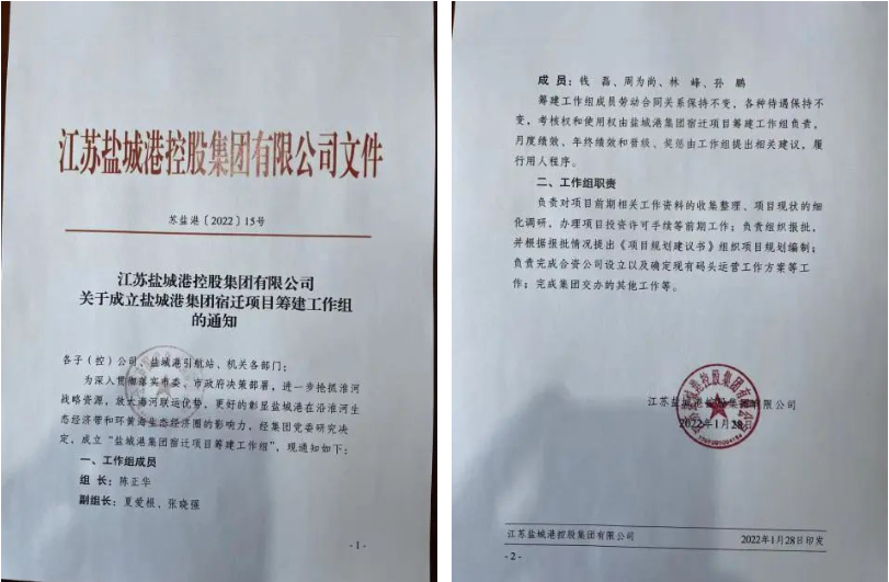 1月28日,鹽城港集團黨委研究成立了宿遷項目籌建工作組;