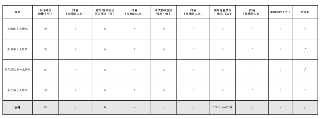2.簽訂意向/框架協(xié)議數(shù)量48份:其中巾幗先鋒隊(duì)14份,黨員先鋒隊(duì)11份,濱海港區(qū)先鋒隊(duì)6份,響水港區(qū)先鋒隊(duì)5份,多式聯(lián)運(yùn)第二先鋒隊(duì)4份,航運(yùn)集團(tuán)先鋒隊(duì)4份,青年先鋒隊(duì)2份,射陽港區(qū)先鋒隊(duì)1份,大豐港區(qū)先鋒隊(duì)1份。