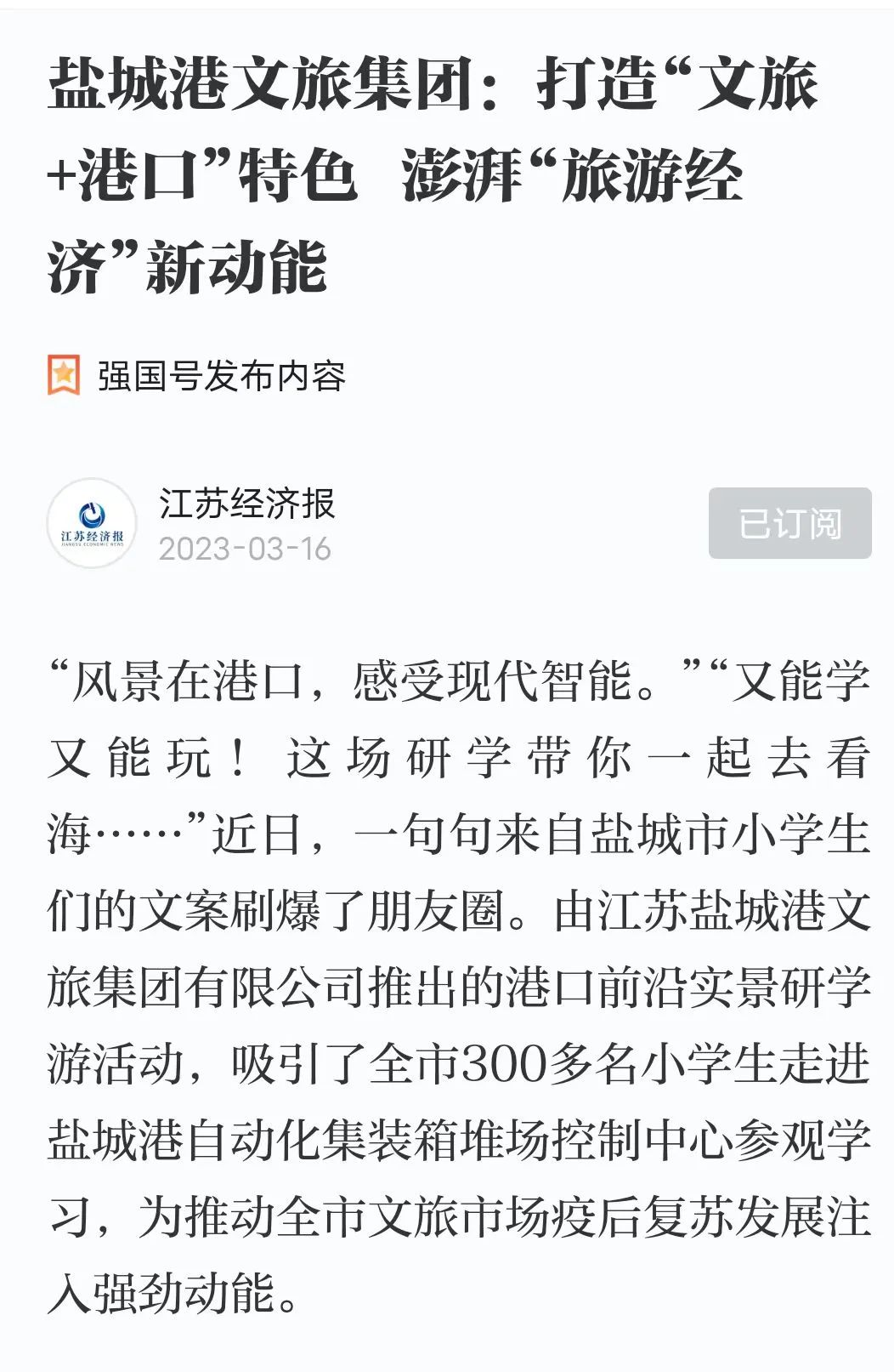 近日,江蘇經(jīng)濟(jì)網(wǎng)、江蘇經(jīng)濟(jì)報(bào)、學(xué)習(xí)強(qiáng)國(guó)等多家主流媒體平臺(tái)集體為鹽城港文旅集團(tuán)點(diǎn)贊!以《鹽城港文旅集團(tuán):打造“文旅+港口”特色 澎湃“旅游經(jīng)濟(jì)”新動(dòng)能》為題對(duì)文旅集團(tuán)在推動(dòng)全市文旅市場(chǎng)疫后復(fù)蘇發(fā)展方面取得的成績(jī)進(jìn)行了報(bào)道。