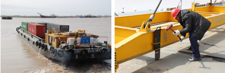 “嗚……”隨著汽笛的一聲長鳴,滿載集裝箱的“大港集003”號貨輪緩緩駛?cè)臌}城港響水港區(qū)5#泊位碼頭,貨船上的工作人員向岸邊拋出系泊纜繩固定貨船,碼頭上等待已久的吊機開始作業(yè),有條不紊地將集裝箱裝卸到拖車上。至此鹽城港響水港區(qū)至重慶果園港內(nèi)河集裝箱班輪航線試運營成功,這是響水港區(qū)從“無”到“有”首次迎來的集裝箱貨輪。同時標志著通榆河段阜寧至響水正式開通內(nèi)河集裝箱運輸,掀開了鹽城港響水港區(qū)與阜寧港區(qū)“港港聯(lián)動”的全新篇章。