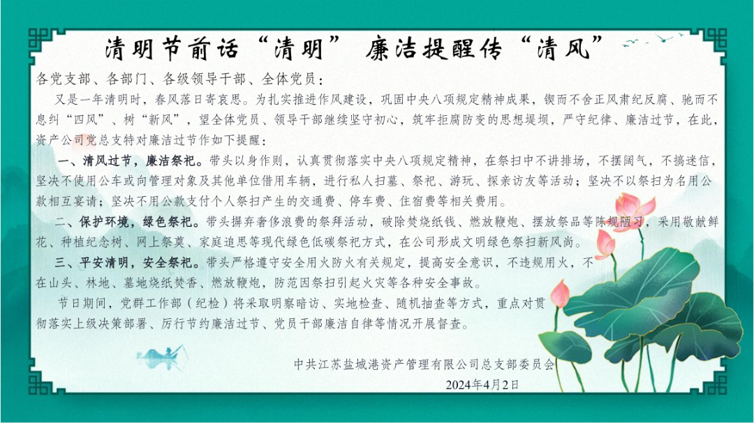 為進一步深化全面從嚴治黨和黨風廉政建設工作,深入推進廉政教育,教育引導全體干部職工嚴守紀律紅線、筑牢廉潔底線,資產公司黨總支堅持“教育在先、警示在先、預防在先”原則,多措并舉、系統施策,打出“教育促廉、承諾悟廉、安全踐廉”等組合拳,堅定不移糾治“四風”,推動節日風氣持續向好。