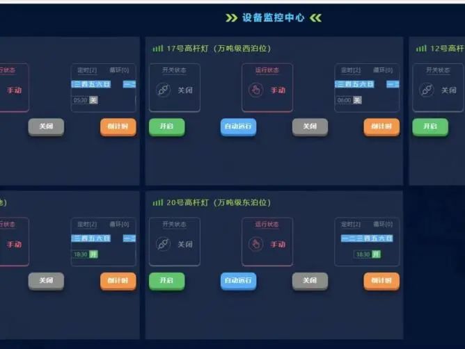 為深入貫徹國(guó)家“雙碳”目標(biāo),射陽(yáng)港區(qū)聚焦節(jié)能降耗、高效運(yùn)行為抓手,利用4G遠(yuǎn)程模塊聯(lián)動(dòng)PC端或微信小程序,實(shí)現(xiàn)港區(qū)高桿燈照明系統(tǒng)的集中控制管理,根據(jù)生產(chǎn)需求合理開(kāi)關(guān)作業(yè)區(qū)域高功率燈具,既降低了人工煩瑣操作,又有效降低電力消耗減少能源浪費(fèi),延長(zhǎng)燈具的使用壽命。據(jù)了解,港區(qū)20桿高桿燈,每日開(kāi)啟平均約8桿高桿燈,每年可節(jié)約電量103680KWh,節(jié)約電費(fèi)8萬(wàn)余元,經(jīng)濟(jì)效益顯著。