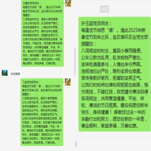 鹽農(nóng)循環(huán)農(nóng)業(yè)堅(jiān)持早研究、早部署、早警示,以節(jié)前“廉”動為抓手,持續(xù)營造風(fēng)清氣正的節(jié)日氛圍,節(jié)前發(fā)送廉潔提醒短信,將警示提醒融入溫馨祝福之中引導(dǎo)全體黨員干部、群眾把好“廉潔關(guān)”繃緊“廉潔弦”。