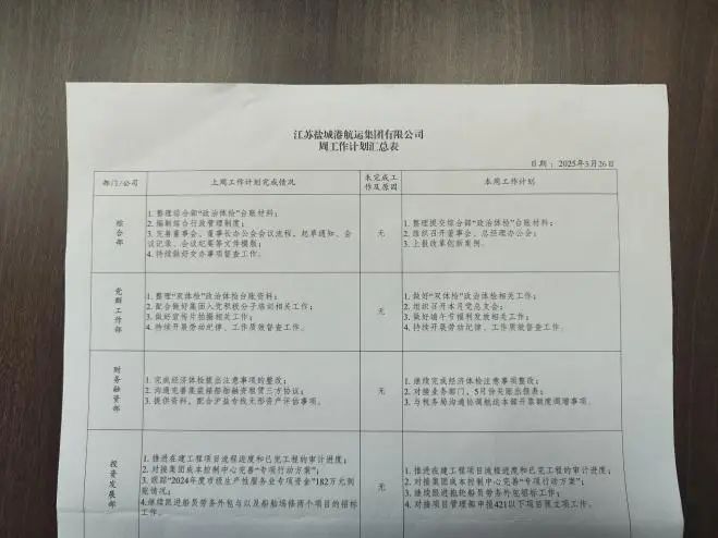 堅持每周一召開工作例會,學習鹽城港集團黨委會“第一議題”相關文件、研究交辦事項完成情況及近期重點工作任務推進情況。采用“三言兩語”匯報機制,各部門(單位)負責人逐一匯報重點工作完成情況及本周工作計劃,分管領導補充完善,主要領導結合集團黨委部署,圍繞航運集團發展實際,就重點工作事項再部署、再強調,進一步提高思想認識,增強做好當前各項重點工作的責任感和緊迫感,牢固樹立“一盤棋”思想,夯實工作責任,細化工作舉措,確保有序推進。