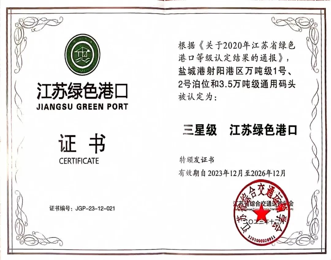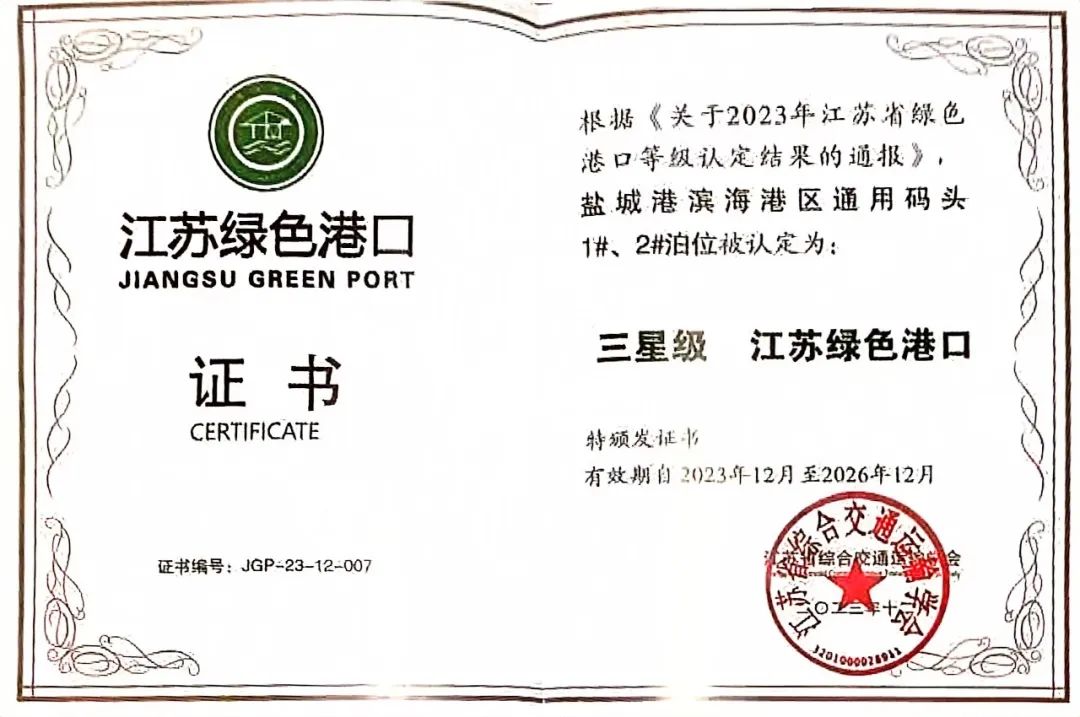 濱海港區(qū)獲得“江蘇省三星級(jí)綠色港口”榮譽(yù)稱號(hào)