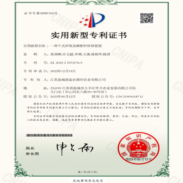 扎實推進科研創新,不斷將理論研究成果轉化到實際生產過程與產品中,截至目前,鹽農循環農業先后取得了3個肥料登記證,獲得自主研發專利24項(其中發明專利4項),另外還有15項專利已受理。率先使用新型機械沼液還田機,實現沼液在旱作物大面積推廣施用,替代70%以上化肥用量,將理論轉化為實際。“沼液在稻麥輪作上施用技術規范”地方標準成功立項,為沼液推廣應用打下堅定的基礎。 申報成功國家高新技術企業、江蘇省農業科技型企業、江蘇省三星上云企業、市級農業產業化龍頭企業等稱號。與揚州大學等高校共同申報的2022年江蘇省碳達峰碳中和科技創新專項資金項目-沿海灘涂農田生態碳匯能力提升模式構建和試驗示范基地建設也正在按進度穩步推進。