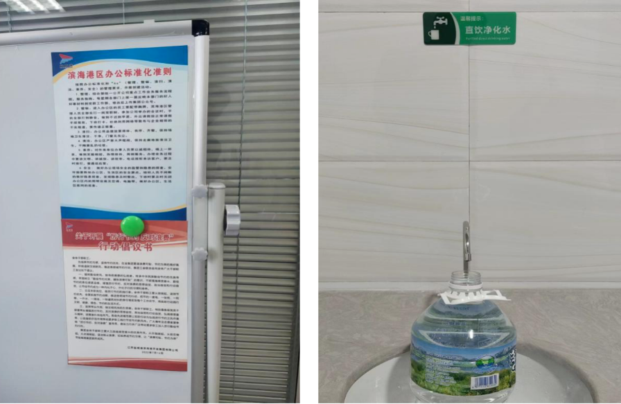 與此同時(shí),濱海港區(qū)還在宿舍生活集聚區(qū)、辦公區(qū)各樓層共安裝了7臺(tái)凈化飲水機(jī),一改過去瓶裝用水浪費(fèi)現(xiàn)象的發(fā)生,弘揚(yáng)了節(jié)儉美德,杜絕了鋪張浪費(fèi)。對公眾場所場地用水處,放置了反對浪費(fèi)、節(jié)約為榮,惜水、愛水(節(jié)水,從我做起)、安全用電等宣傳標(biāo)牌,以多種形式營造綠色節(jié)儉、文明用水、安全用電的勤儉氛圍。