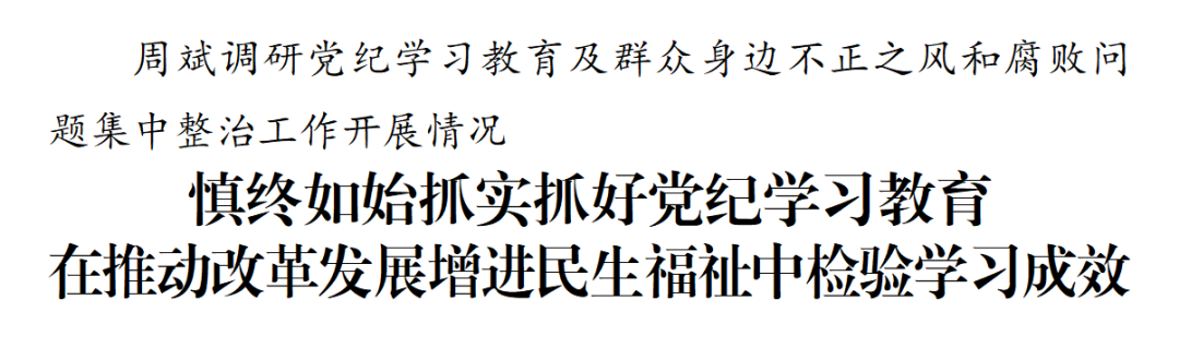 周斌在調(diào)研中指出,黨紀學習教育要強化原文研學,深學細悟習近平總書記關于全面加強黨的紀律建設的重要論述,堅持融入日常、抓在經(jīng)常,持續(xù)在深化內(nèi)化轉化上下功夫,引導黨員干部更好把遵規(guī)守紀刻印在心。要強化警示教育,用好紅色資源、鮮活案例和生動現(xiàn)場,加強正面引導和反面警示,讓黨員干部受警醒、明底線、知敬畏,真正做到知行知止。要強化學用結合,堅持兩手抓、兩促進,將黨紀學習教育與整治形式主義為基層減負、整治群眾身邊不正之風和腐敗問題、推進經(jīng)濟社會高質(zhì)量發(fā)展相結合,在嚴格約束下積極擔當作為,切實把學習成效轉化為推動改革發(fā)展、增進民生福祉的實際舉措,真正讓黨員受教育、發(fā)展見成效、群眾得實惠。