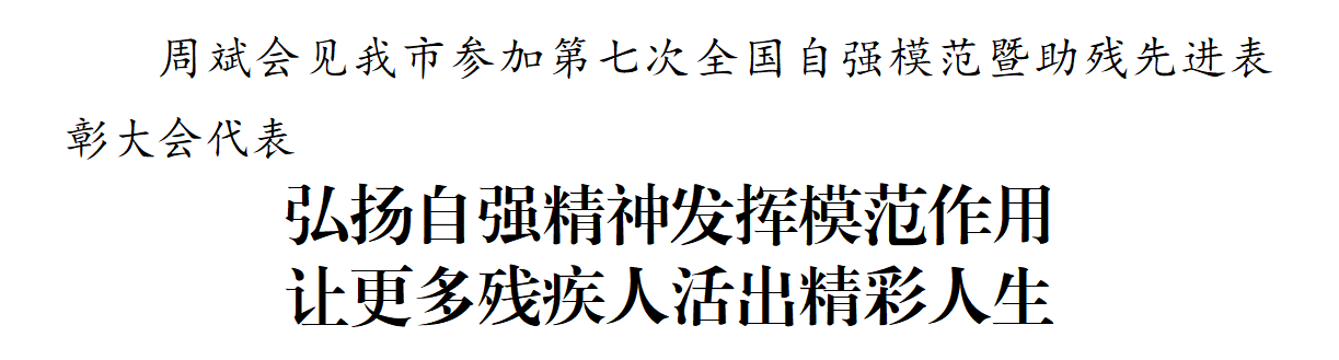 5月26日,市委書記周斌會見我市參加第七次全國自強(qiáng)模范暨助殘先進(jìn)表彰大會代表,向受表彰對象表示祝賀,向全市廣大殘疾人和殘疾人工作者致以問候,希望全市上下認(rèn)真學(xué)習(xí)貫徹習(xí)近平總書記關(guān)于殘疾人事業(yè)的重要指示精神,全面落實(shí)中央和省委部署要求,讓更多殘疾人活出精彩人生,在新征程上推動我市殘疾人事業(yè)高質(zhì)量發(fā)展。